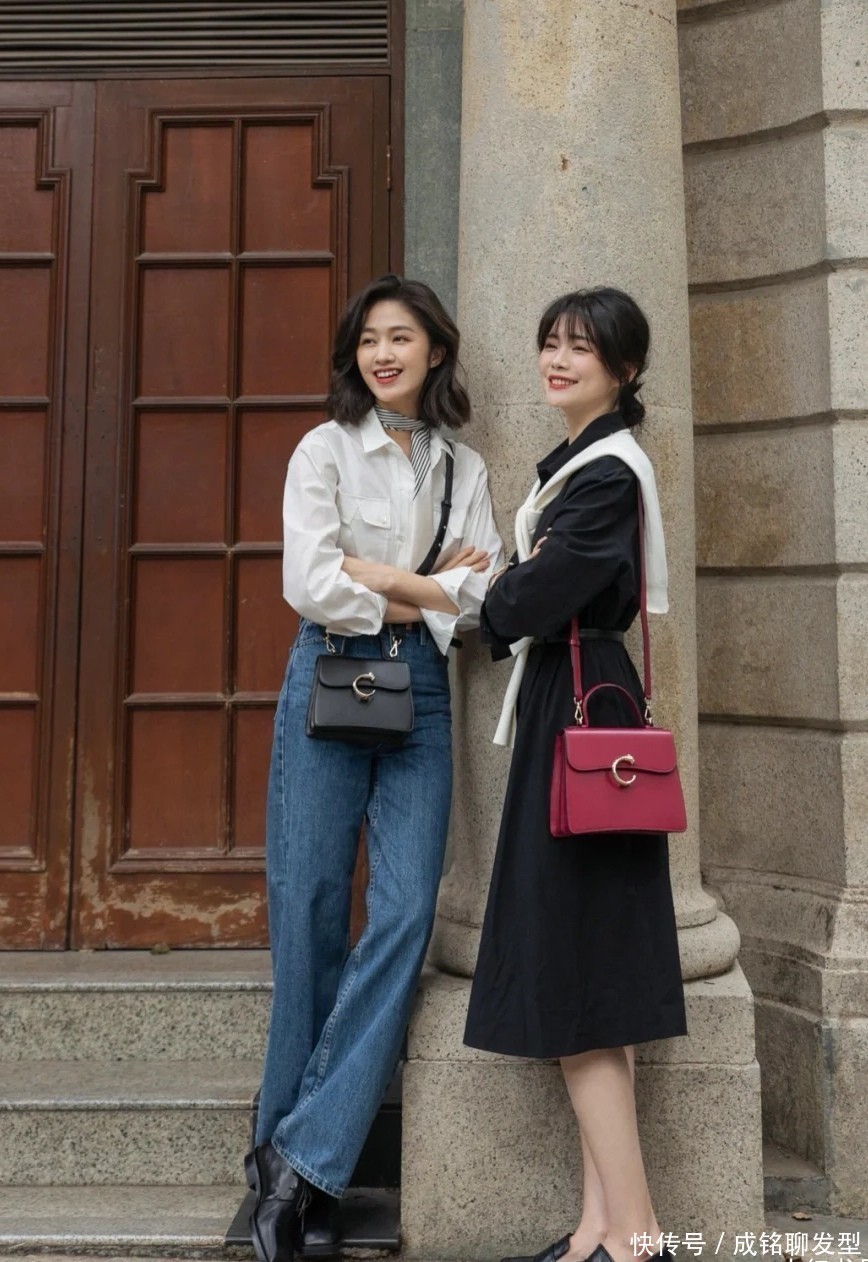 和闺蜜凹造型的时候,或许还可以在配饰的搭配上呼应起来,比如包包搭配起来就可以体现你的魅力,并且体现搭配的时尚感,像这对闺蜜的搭配就呼应起来了,红色和黑色的包包点缀了整个造型,两个人搭配的颜色也有所呼应,非常时髦。