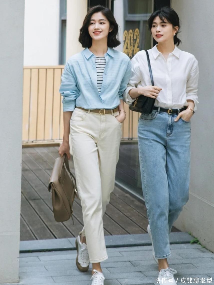 衬衫的搭配非常多,和闺蜜一起穿上也未尝不可,在搭配衬衫的时候就可以借鉴不同的颜色,白衬衫,绿色衬衫,看起来都非常清爽有活力,结合牛仔裤搭配还很显年轻,比如下图的牛仔裤结合衬衫,轻轻松松就体现了高级感,看起来整个人都非常的干练。