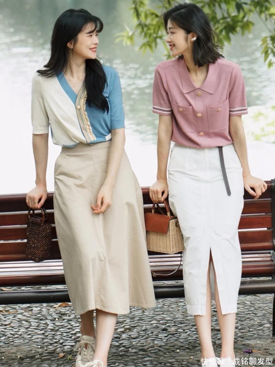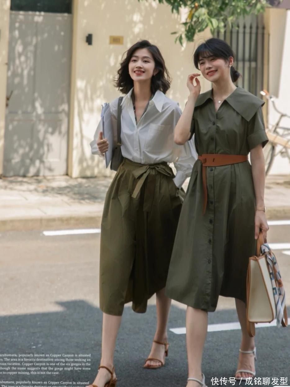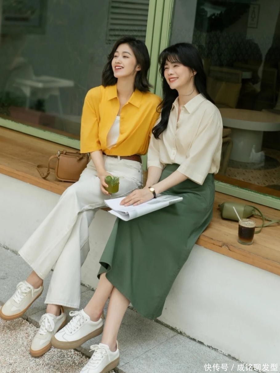 冷色系的服饰和暖色系的服饰碰撞也会帮我们增添层次感,如果你的搭配以冷色系为主,那么你的闺蜜就可以搭配暖色系的服饰,比如博主用黄色和绿色的单品相互对应,看起来就很和谐,黄色的衬衫搭配白色阔腿裤,米色的衬衫搭配绿色半身裙,色彩之间的呼应恰到好处,非常的时髦和高级,对于搭配小白来说也很值得借鉴。